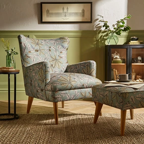 The Marlow Wing Chair is finished in a stunning Arboretum print, a design inspired by and celebrating the beautiful UK leafy woodlands that not only provide homes for wildlife but are also an important tool against climate change. The classic wingback silhouette paired with the timeless wood legs provide a look that suits any home and is sure to stand the test of time. This armchair can be purchased with a matching footstool for even greater comfort. Made with responsibly sourced timber, you can relax the night away in style and with good conscience.